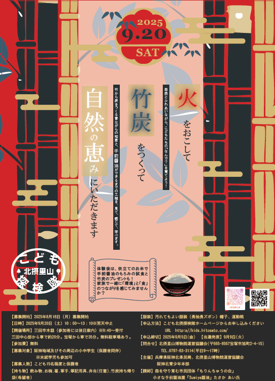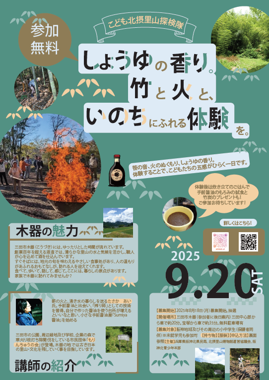 平成23年「北摂里山博物館」構想を策定し、平成24年度から構想推進の一事業として実施している。北摂里山博物館の対象地区をフィールドとする環境体験学習として年間6回開催。 今回は三田市木器で自然と触れ合いながら、火起こし、竹炭づくりや手前醤油の工程見学等を実施。