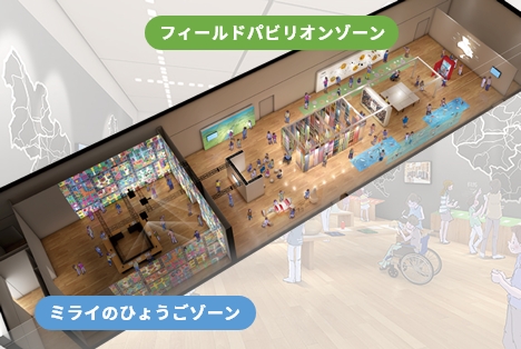 ミライのひょうごゾーン県内の子どもたちに「こんなひょうごに住んでみたい」というテーマで募集した絵画を、大きな1つのまちとしてデジタルアートで展示します。また、来場者が描いた乗り物がデジタルアートの中に入り込む仕掛けも施されています。