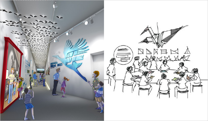 県内の子どもたちが制作した県鳥コウノトリの折り紙を、万博期間中に兵庫県ゾーンの回廊空間(ウェイティングゾーン)の天井面等に吊り下げ展示します。